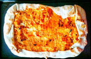 While acorn squash and leeks are roasting, roll out the piecrust to fit a rectangular cookie baking sheet, set aside until ready to use.